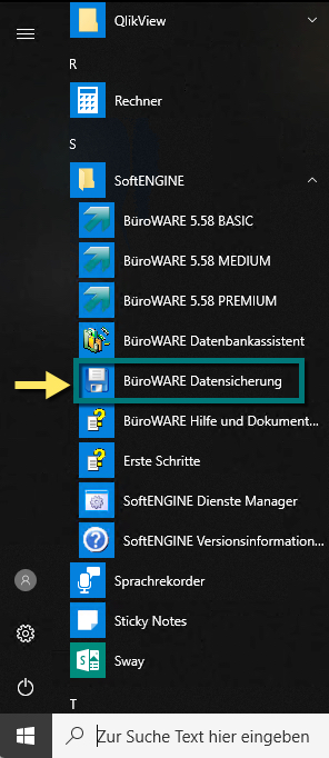 Starten Sie „BWQuickzip“ über das Windows-Startmenü Eintrag „Softengine“ ➔ „BüroWARE Datensicherung“ oder direkt durch Aufruf der Datei „BWQuickzip.exe“ im Programmverzeichnis.