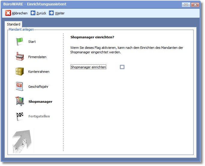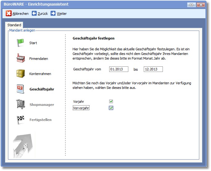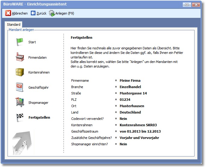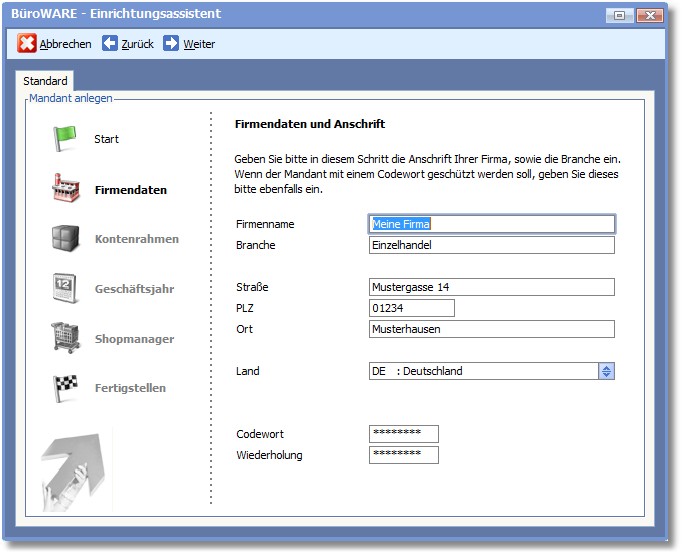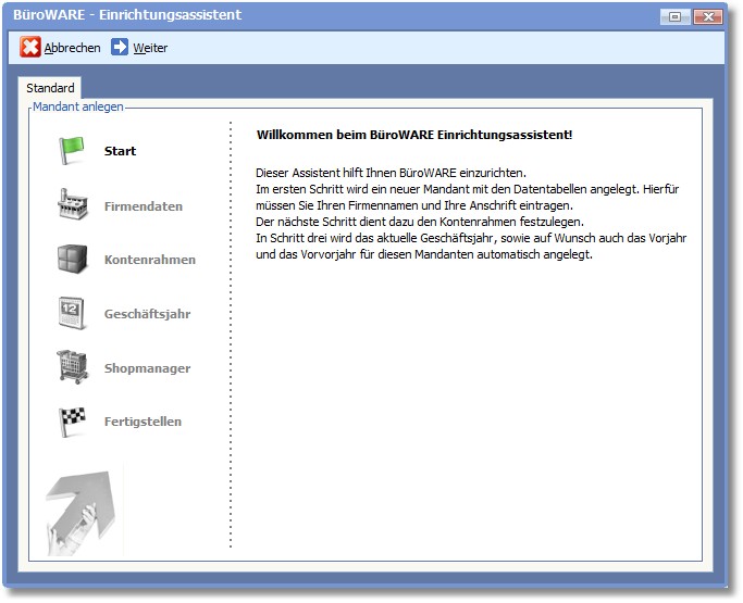 Der Einrichtungsassistent hilft Ihnen beim Anlegen eines neuen Mandanten. Die Einrichtung erfolgt dialoggeführt in 6 Schritten:
