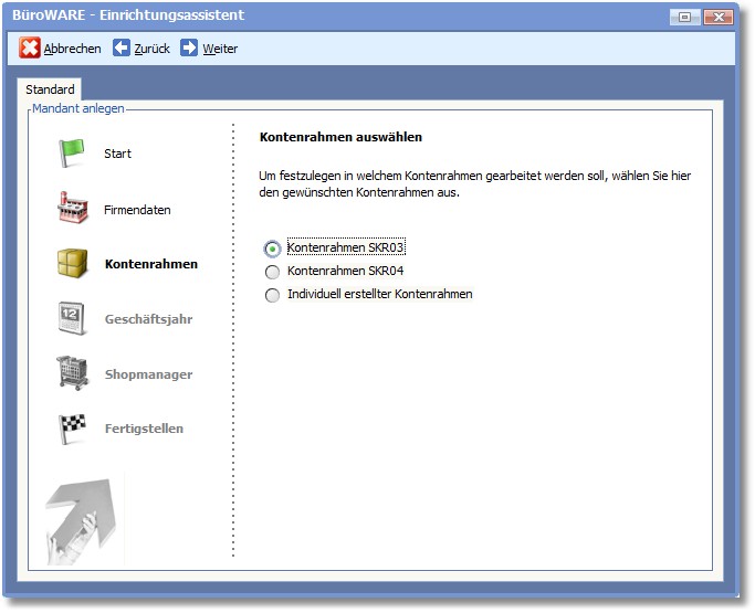 Wählen Sie hier durch Aktivierung des entsprechenden Radiobuttons den zu installierenden Kontenrahmen und drücken Sie [ALT]+[W] oder Klicken Sie auf "Weiter".