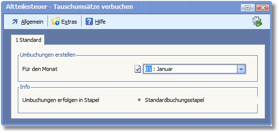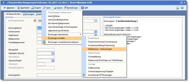 1. Wählen Sie in der Buchungsmaske den Menüpunkt "Tools > Buchungen erstellen > Altteilesteuer - Umbuchungen".