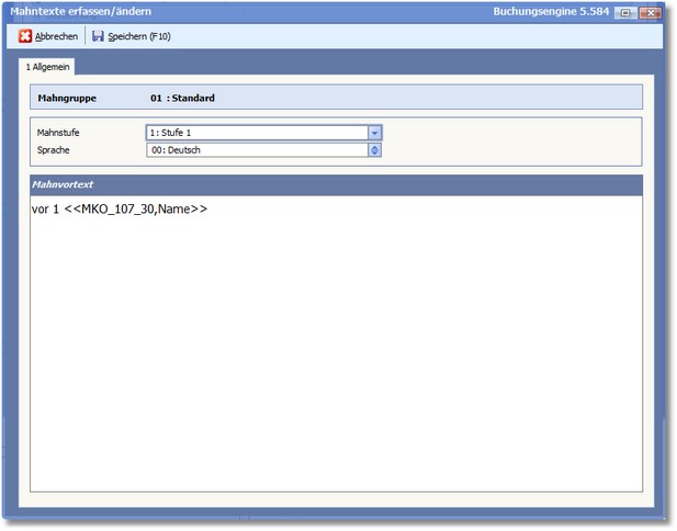 Im Bereich "Mahnvortext" wird der Mahnvortext für die jeweilige Mahnstufe eingetragen. Für die Gestaltung Ihrer individuellen Briefvorlage können Sie mit [F5] die Variablenauswahl nutzen.
