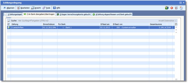 In der Karteikarte "2 An Bank übergeben/übertragen" werden alle Zahlungsstapel angezeigt, die bereits an die Bank übergeben wurden.