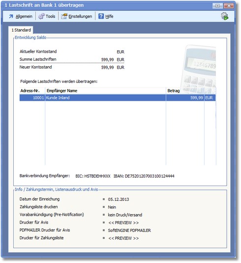 Hier können Sie die Einstellungen zum Zahlungseingang überprüfen und ggf. über die Funktionen der Menüleiste bearbeiten. Starten Sie anschließend den Export mit [F9].