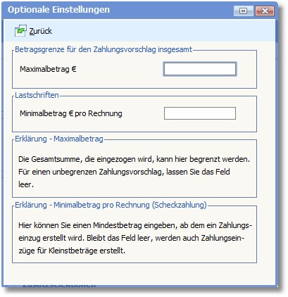 Hier können Sie weitere Einstellungen für den Zahlungsvorschlag vornehmen, einen Höchstbetrag für den Zahlungsvorschlag sowie einen Mindestbetrag für Lastschriften hinterlegen.