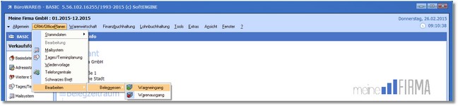 1. Klicken Sie mit der Maus im Hauptmenü auf "CRM/OfficePlaner/Bearbeiten > Belegwesen > Wareneingang".