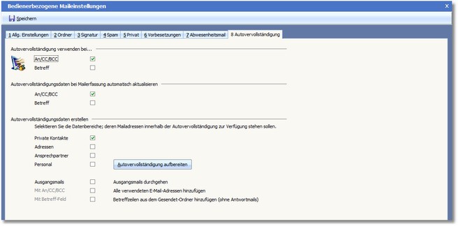 << Hier KLicken um eine Inhaltsübersicht anzuzeigen >> Navigation: OfficePlaner > Mailsystem > Mail einrichten > E-Mail-Assistent - Extras > Bedienerbezogene Einstellungen > Die Karteikarte "Autovervollständigung" |