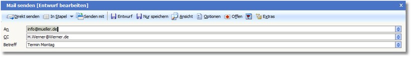 In den Feldern An/CC/BCC und BETREFF kann die Autovervollständigung verwendet werden. Die Einstellungen für die Autovervollständigung werden unter „Extras > Bedienerbezogene Einstellungen > Karteikarte "Autovervollständigung“ vorgenommen.
