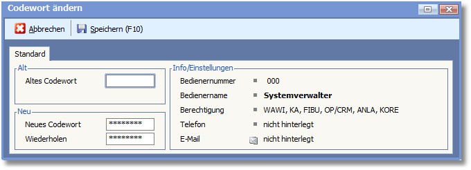 Über den Menüpunkt "Datei > Codewort ändern" haben Sie die Möglichkeit, das Codewort für den aktuell angemeldeten Bediener zu ändern: