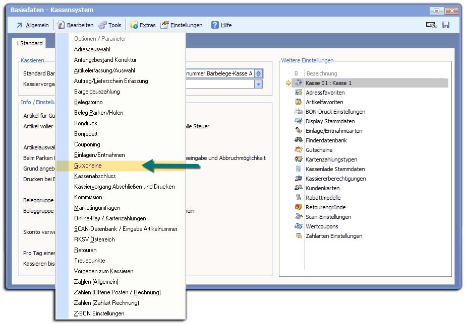 Wechseln Sie in die "Basisdaten Kasse" ➜ Menü "Bearbeiten" ➜ Menüeintrag "Gutscheine".