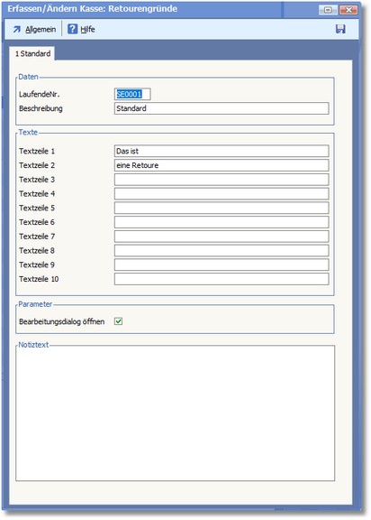 Navigation:  Kassensystem > Technische Informationen (Systeminformation) > Vorbereitende Arbeiten > Grundeinrichtung der Kasse > Detaileinrichtung der Kasse (Basisdaten) > Weitere Einstellungen > Retourengründe >