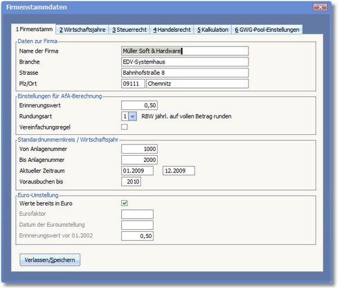 Hier werden allgemeine Angaben zu Ihrer Firma hinterlegt. Weiterhin können Sie hier einige Grundeinstellungen zur AfA-Berechnung und zur Verwaltung Ihrer Anlagegüter eintragen.