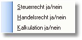 abschreiben. Sie können festlegen, für welchen der drei Bereiche eine Buchung gelten soll. Die Voreinstellung ist so festgelegt, dass in jedem der drei Bereiche eine Buchung erfolgt. Über ein Pop-Up- bzw. Auswahlmenü können Sie nun gezielt Bereiche abwählen. Die Tastenkombination [SHIFT]+[F10] öffnet eine Menütafel, die die Bereiche Steuerrecht, Handelsrecht und Kalkulation auflistet.