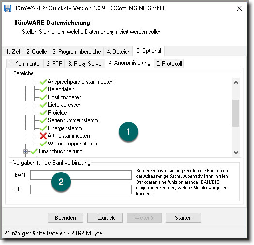 „BWQuickZIP“ ist nur mit der Standard BüroWARE-Version kompatibel. Das heißt, die Anonymisierung darf z.B. in einer PPS nicht auf Bereiche angewandt werden, bei denen die Satzbeschreibung vom Standard abweicht.
