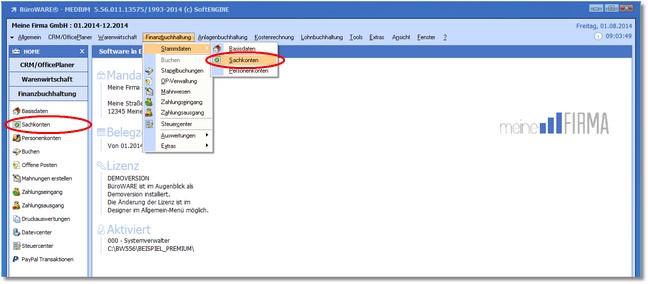 1.Klicken Sie mit der Maus im Hauptmenü auf "Finanzbuchhaltung > Stammdaten > Sachkonten"
