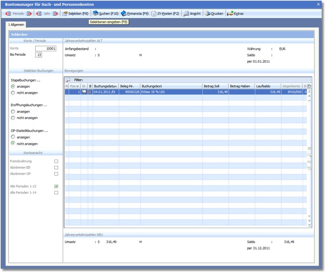 LAUFSALDO zeigt das Ergebnis aus Soll- und Habenbuchung in Euro (Titelleiste).