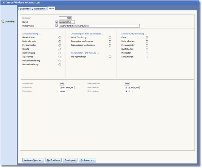 In der Karteikarte "EAP" definieren Sie das Verhalten dieser Kostenart bei Auswertungen über das Tool EAP (Auswertungen).
