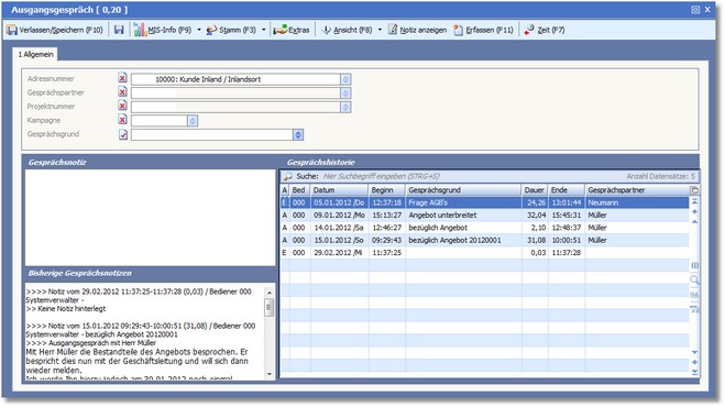 Die [F10]-Taste speichert die Notiz zum Ein- Ausgangsgespräch und Sie kehren zum Ausgangspunkt (Karteikarte) zurück.