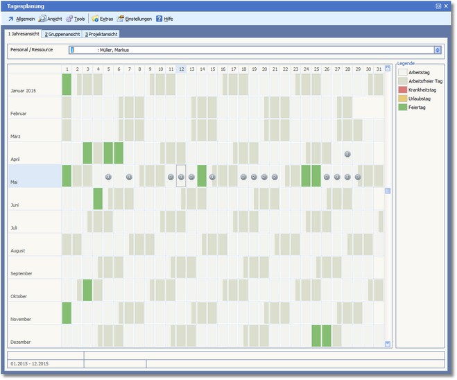 Diese Übersicht ist mitarbeiterbezogen und zeigt die einzelnen Monate und Tage des Jahres.
