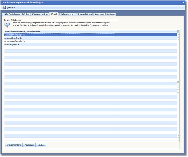 In dieser Karteikarte können Sie Mailadressen als "privat" kennzeichnen. Alle Mails dieser Adresse sind für andere Bediener nicht sichtbar.