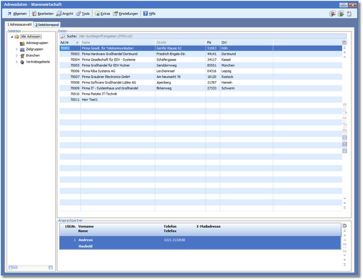 Diese Tabelle zeigt alle angelegten Lieferanten des Adressstamms.