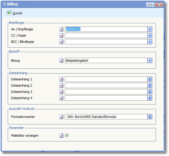 Wenn Sie den Textbaustein mit eBILLING als PDF-Dokument per E-Mail versenden wollen, sind folgende Einstellungen zu hinterlegen: