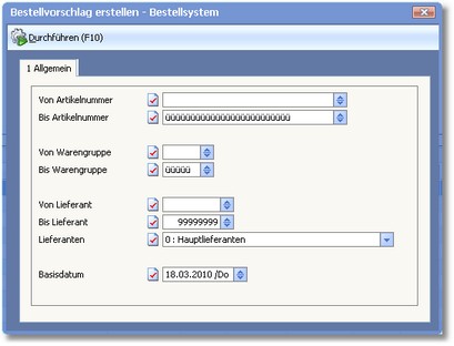 Das Programm öffnet das Dialogfenster "Bestellvorschlag erstellen - Bestellsystem".