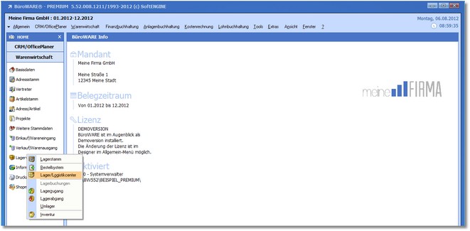 1. Klicken Sie mit der Maus im Arbeitsplatz der Warenwirtschaft auf "Lagerverwaltung > Lager/Logistikcenter".
