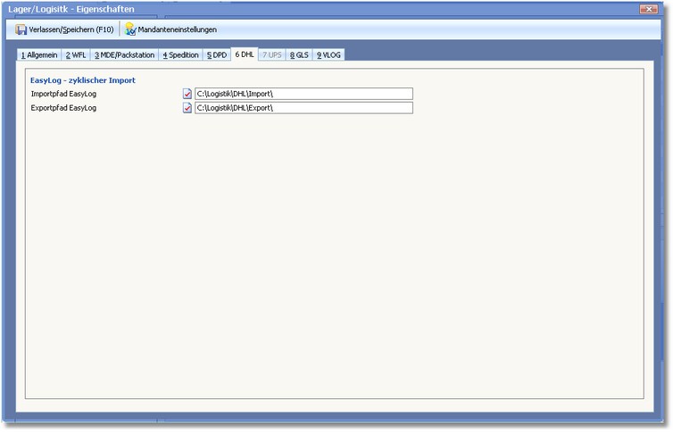 In dieser Karteikarte sind die Export-/Import-Einstellungen für die Schnittstelle zur DHL-Software EasyLog festzulegen.