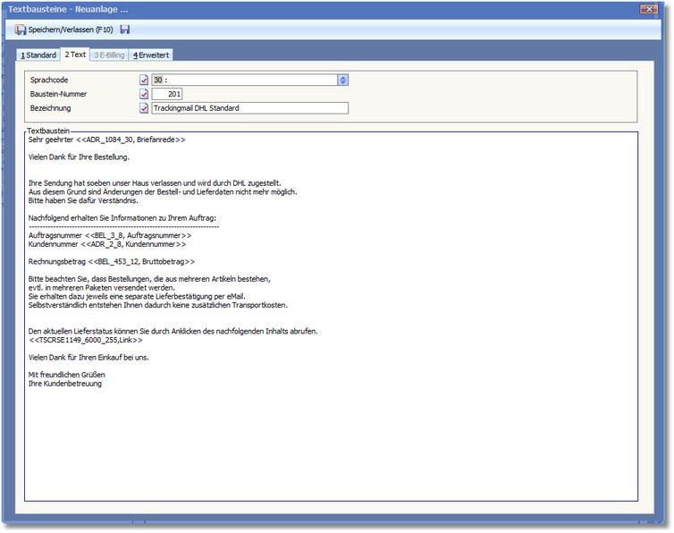 Für die Neuanlage eines entsprechenden Textbausteins beachten Sie bitte das Kapitel Textbausteine.