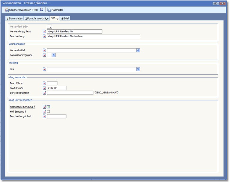 Der Bereich "VLog Versandart"
