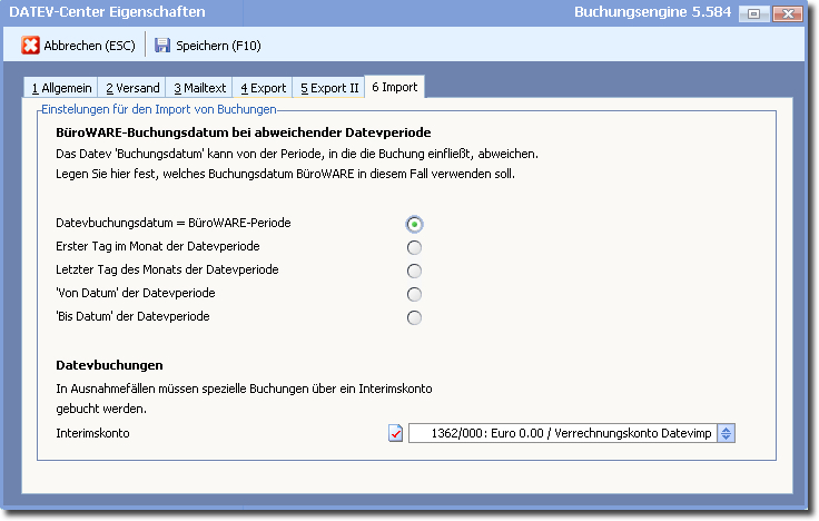 Hier ist das Buchungsdatum bei abweichender Datev-Buchungsperiode und das INTERIMSKONTO festzulegen.