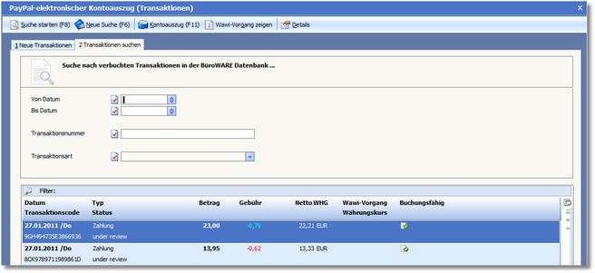 Mit [F11] können Sie sich den Kontoauszug der im Firmenstamm hinterlegten PayPal-Bank anzeigen lassen.