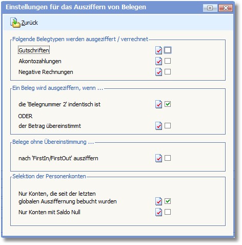 Legen Sie hier durch Aktivierung der Auswahlkästchen fest, ob Gutschriften und/oder Akontozahlungen und/oder Negative Rechnungen beim Ausziffern berücksichtigt werden sollen.