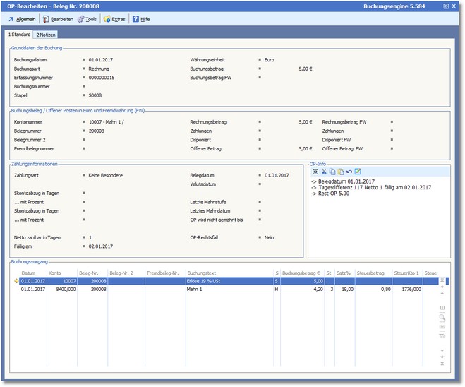 << Hier KLicken um eine Inhaltsübersicht anzuzeigen >> Navigation: Finanzbuchhaltung > Laufende Vorgänge > OP-Verwaltung > Karteikarte "Offene Posten" > OP bearbeiten |