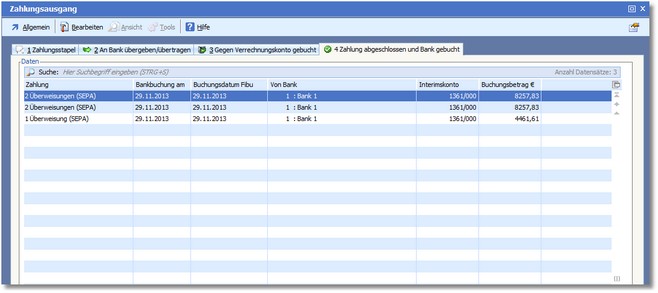 In dieser Karteikarte werden alle Zahlungsstapel angezeigt, die erfolgreich an die Bank übertragen und in der Finanzbuchhaltung verbucht wurden.