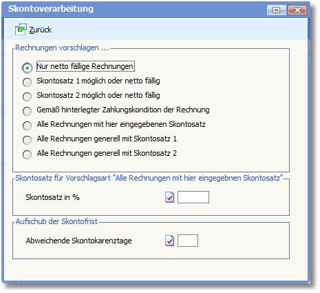 Legen Sie hier fest, welche Rechnungen beim automatischen Zahlungseinzug berücksichtigt werden sollen. Weiterhin können Sie hier auch Rechnungen mit einem hier anzugebenden Skontosatz sowie Skontokarenztage für Ihre Kunden festlegen.