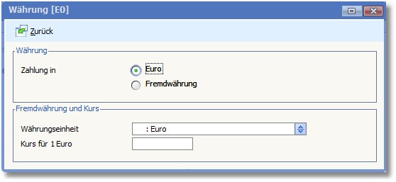 Mit der Funktionstaste [F5] können Sie hier die Auswahltabelle der Währungseinheiten aufrufen, in der Sie die gewünschte Fremdwährung auswählen und mit [RETURN] in das Feld übernehmen können.