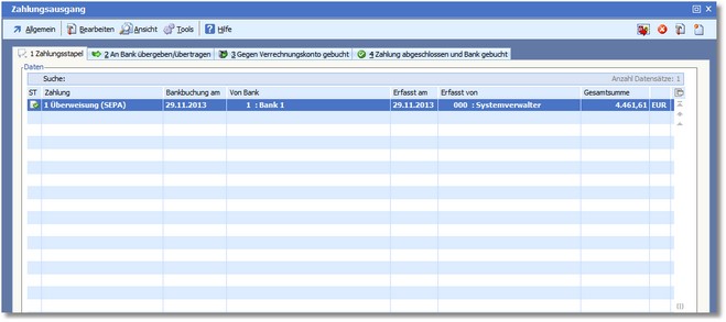 Das Programm öffnet den Dialog zur zentralen Bearbeitung von Zahlungsausgängen.