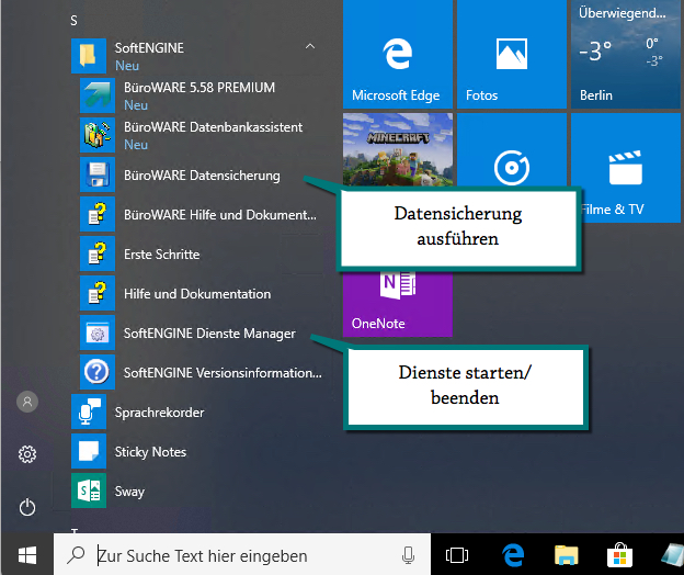 Dafür können Sie unter anderem den SoftENGINE Dienste Manager und das Tool "BüroWARE Datensicherung" verwenden.