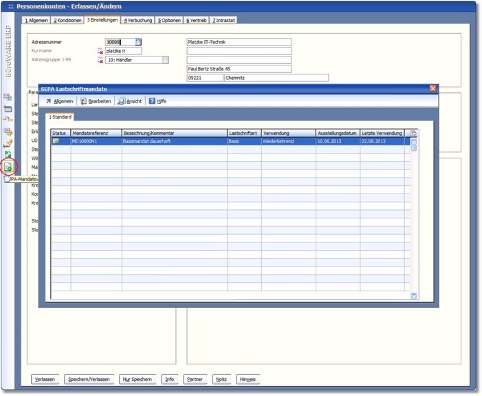 5. Mit Doppelklick bzw. [RETURN] auf einem Datensatz in der Tabelle können Sie das jeweilige Mandat bearbeiten: