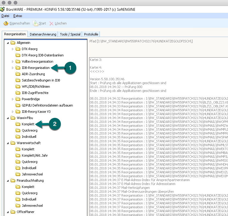 Nun zuerst die IDB-Reorganisation ➊ und danach die WAWI-FIBU-Komplettreorganisation ➋ starten.