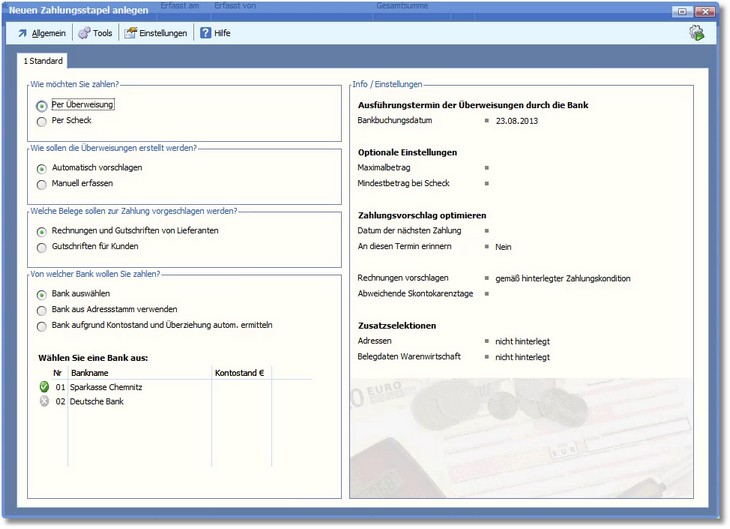 Hier können Sie festlegen, wie gezahlt werden soll, ob Sie manuelle Überweisungen erstellen wollen oder ob diese automatisch vorgeschlagen werden sollen, welche Belege gezahlt werden sollen und für welche Bank Sie zahlen wollen. Weiterhin gibt es noch optionale Einstellungen, wie bspw. Maximalbeträge und Angaben zur Optimierung des Zahlungsvorschlags.