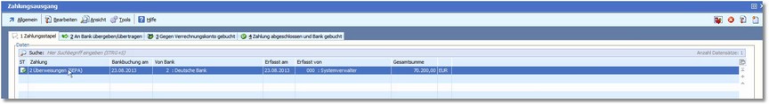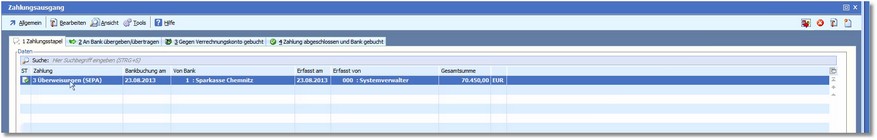 Im Zahlungsausgang wurde damit der Zahlungsstapel von der Registerkarte 3 verschoben und befindet sich nun als abgeschlossen in der Registerkarte "4 Zahlung abgeschlossen und Bank gebucht".