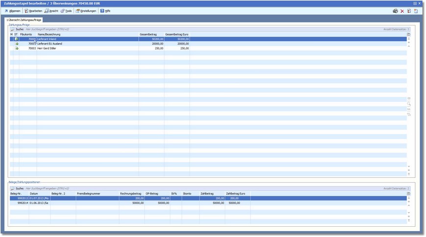 Sie sehen in der Tabelle die Lieferanten, an die gezahlt wird und im unteren Bereich wird eine Übersicht angezeigt, aus welchen Einzelpositionen die Zahlung an den in der Tabelle markierten Lieferanten besteht.