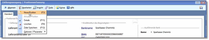 Hier können Sie die einzelnen Positionen über das "Bearbeiten"-Menü wie gewohnt bearbeiten: neue Positionen erfassen, Details anschauen, Positionen löschen, Zeile speichern usw.