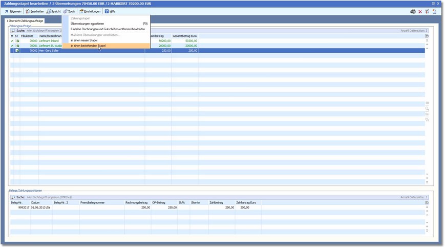 Die Übersichtstabelle können Sie bearbeiten und beispielsweise Zahlungen, die sie zu diesem Zeitpunkt noch nicht ausführen möchten, in einen anderen Stapel verschieben bzw. Zahlungen, die Sie von einer anderen Bank ausführen wollen, in einen anderen Bankstapel verschieben.