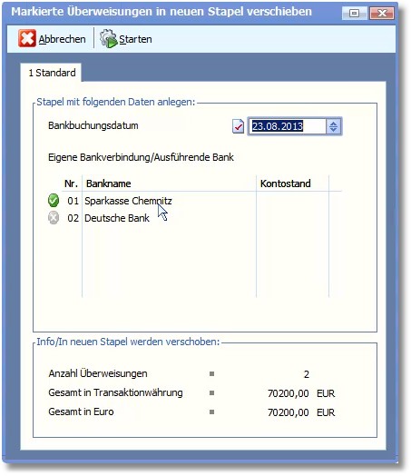 den Stapel für Bank 1 und die verschobenen Überweisungen in einem zweiten Stapel.