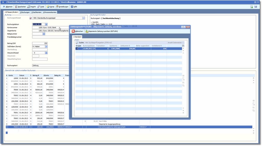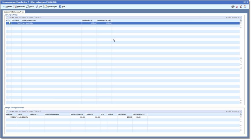 5. Durch Doppelklick auf eine Lieferantenzahlung können Sie die Positionserfassung für diese Zahlung öffnen, in der die einzelnen Zahlungspositionen aufgeführt sind.