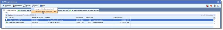 8. Über den Menüeintrag "Tools > Überweisungen exportieren" können Sie diese Überweisungen als SEPA-Datei exportieren und an die Bank übertragen.