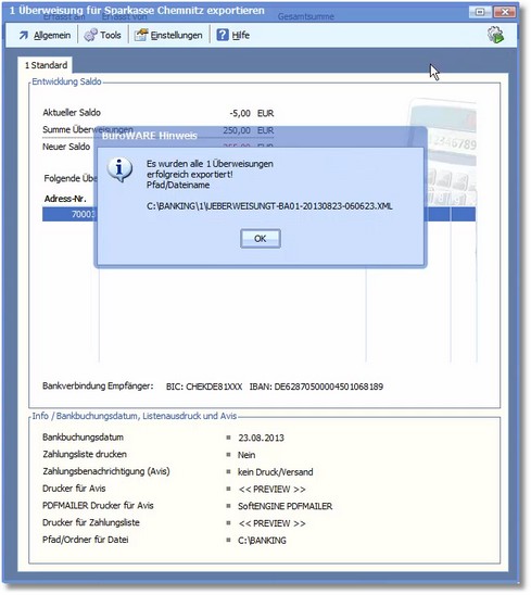 Sie erhalten eine Meldung, dass die Datei wurde erstellt und in den im Hinweisfenster angegebenen Ordner exportiert wurde.